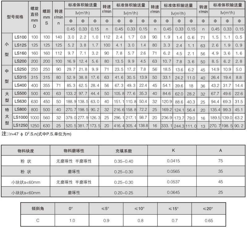 (1)螺旋輸送機(jī)的螺旋葉片有實(shí)體螺旋面型、帶式螺旋面型及葉片螺旋面型三種。實(shí)體螺旋面稱(chēng)為s制法,其螺旋節(jié)距GX型為葉片直徑的0.8倍,LS型螺旋輸送機(jī)適用于輸送粉狀和粒狀物料。帶式螺旋面又稱(chēng)D制法,其螺旋節(jié)距與螺旋葉片直徑相同,適用于輸送粉狀及小塊物料。葉片式螺旋面應(yīng)用較少,主要用于輸送粘度較大和可壓縮性物料,在輸送過(guò)程中,同時(shí)完成攪拌、混合等工序,其螺旋節(jié)距約為螺旋葉片直徑的1.2倍。